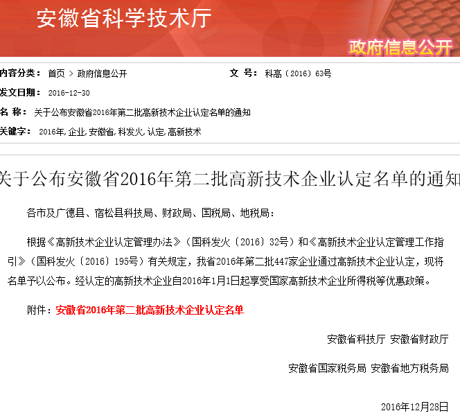 日前,安徽省高新技術(shù)企業(yè)認定管理領(lǐng)導(dǎo)小組公布了安徽省2016年第二批新認定高新技術(shù)企業(yè)評選結(jié)果,我公司憑借不斷增強的企業(yè)自主創(chuàng)新能力、良好的企業(yè)成長性及完善的經(jīng)營管理和服務(wù)體系,榮獲“高新技術(shù)企業(yè)”稱號。